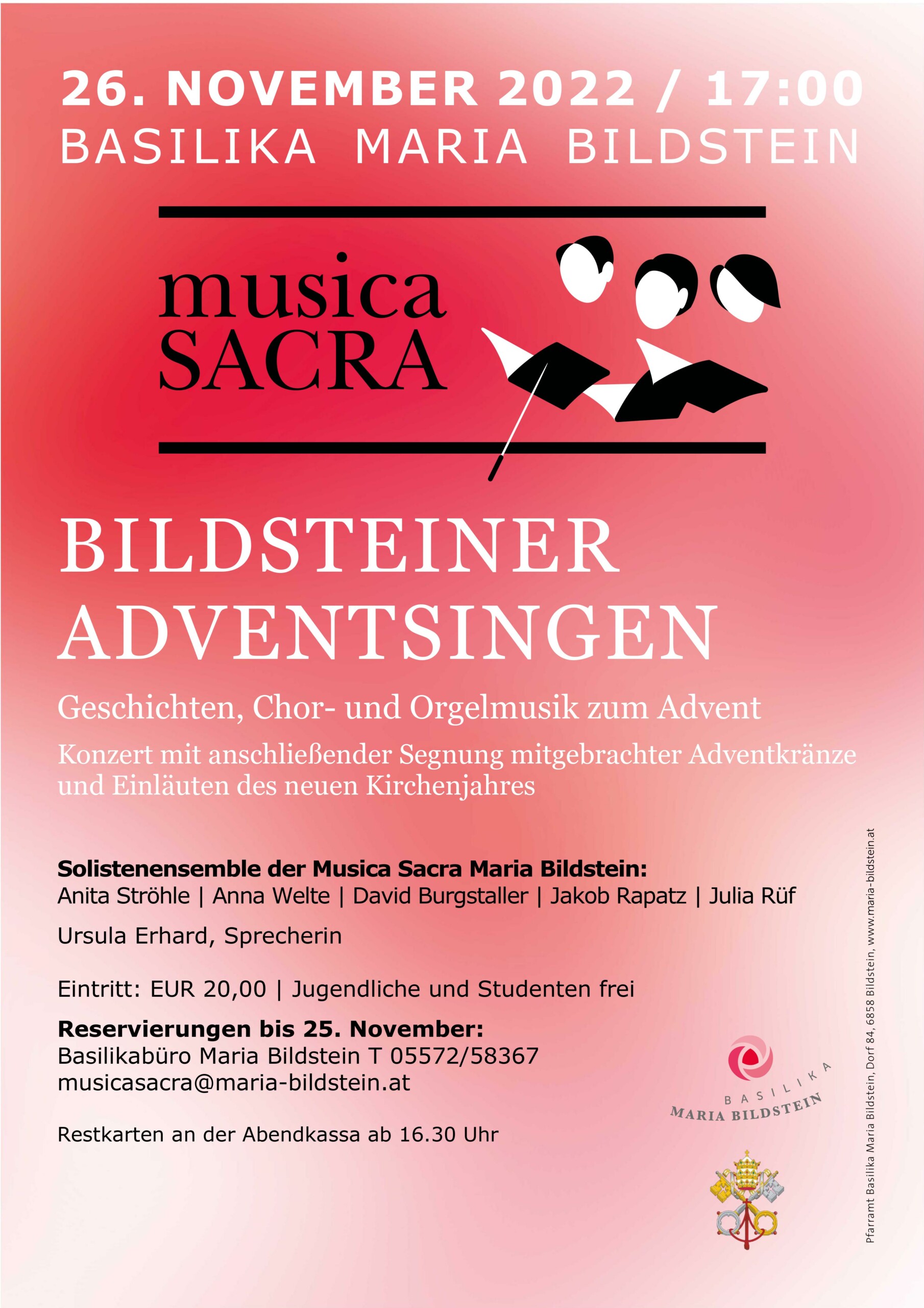 Der Eintritt beträgt EUR 25,00 / Person. Kartenreservierungen sind noch bis Freitag, 1. Dezember, bevorzugt  per Email unter musicasacra@maria-bildstein.at und telefonisch zu den Öffnungszeiten im Basilikabüro Bildstein möglich.