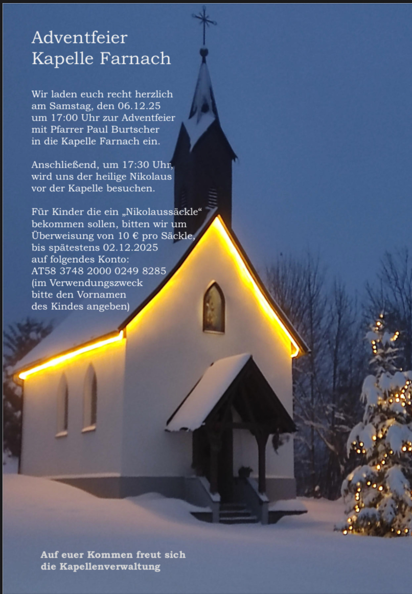 Wir laden recht herzlich zur Adventfeier in der Kapelle Farnach ein. Anschließend, um 17:30 Uhr, wird uns der heilige Nikolaus vor der Kapelle besuchen. Genauere Details und Anmeldung für das Nikolaussäckle findet ihr hier: Adventfeier Farnach + Nikolo_2025